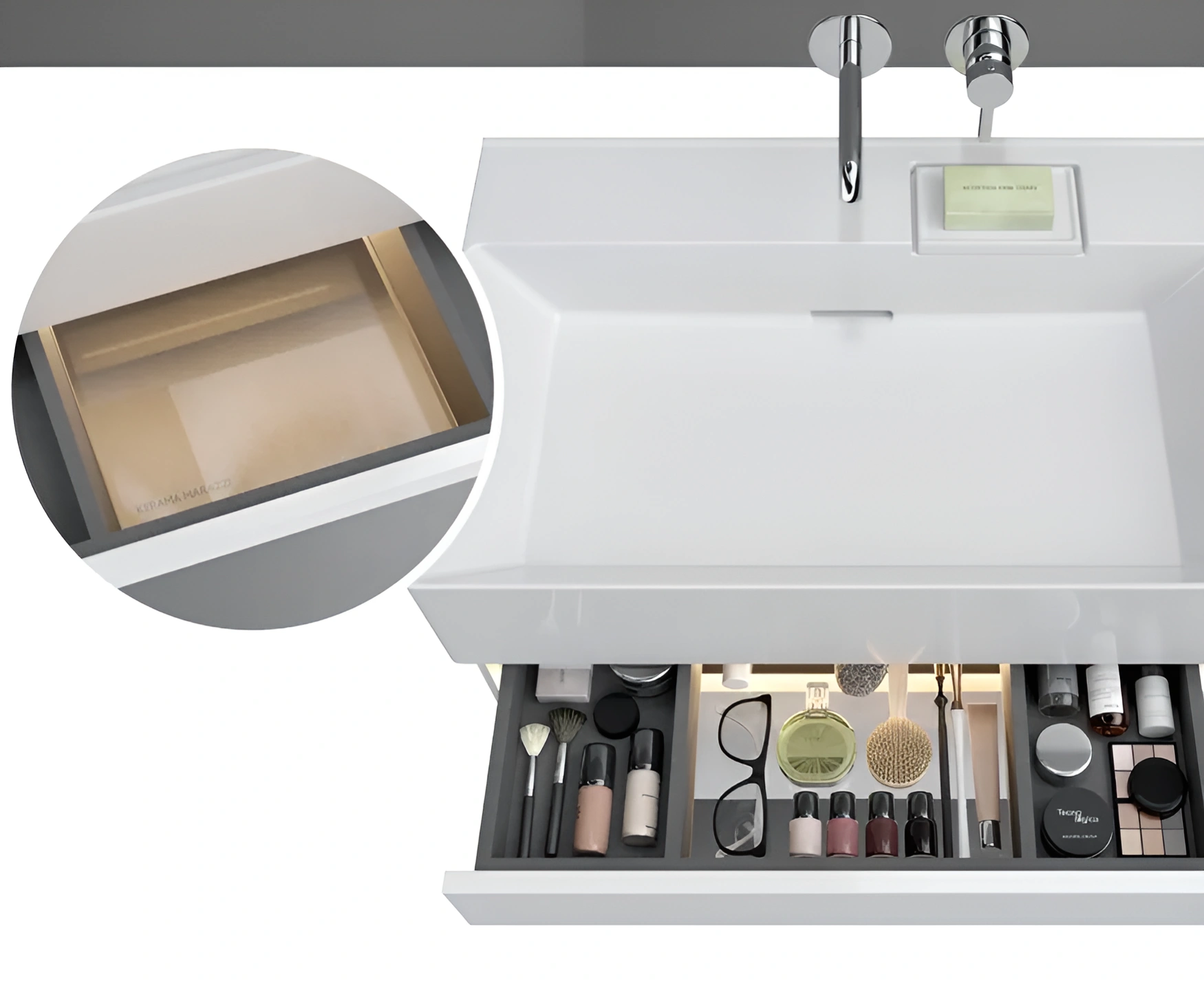 МДФ - очень популярный у производителей мебели для ванных комнат материал, который представляет собой древесноволокнистую плиту средней плотности, производимую путем спрессовывания волокон под сверхвысоким давлением. МДФ обладает высокой прочностью, влагостойкостью и при этом прост в производстве. Основными достоинствами МДФ можно назвать отсутствие реакции на резкую смену температур, стойкость к физическому воздействию, а так же тот факт, что изделия из МДФ огнеупорны и практически гипоаллергенны.